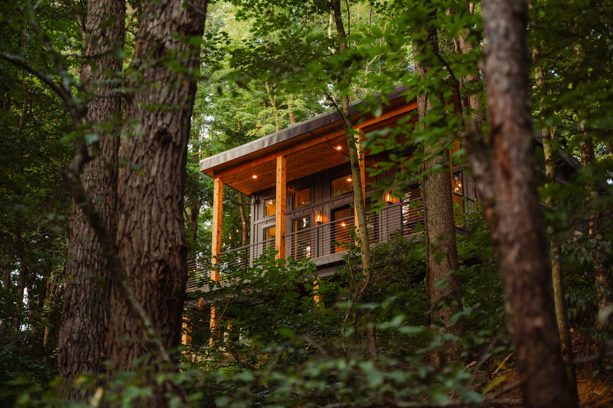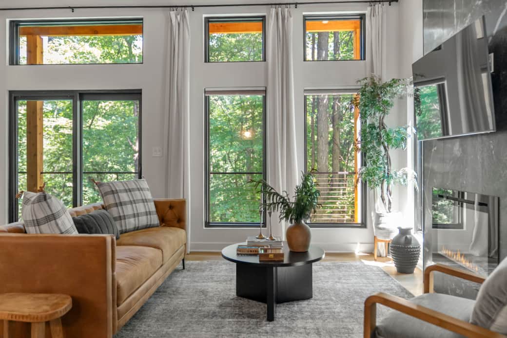 The Nest at Dunlap Ridge is a brand NEW MODERN Couples Cabin nestled in Hocking Hills. Be prepared to fall in love with the panoramic floor to ceiling windows, the warm, organic modern decor, and the privacy! Whether you decide to spend your time on the deck drinking coffee, soaking in the hot tub or enjoying S'mores by the secluded fire-pit you are sure to be impressed! The Nest has a fully equipped Kitchen, a Modern Bathroom, a King size bed, an Indoor Fireplace, and stunning interior decor.